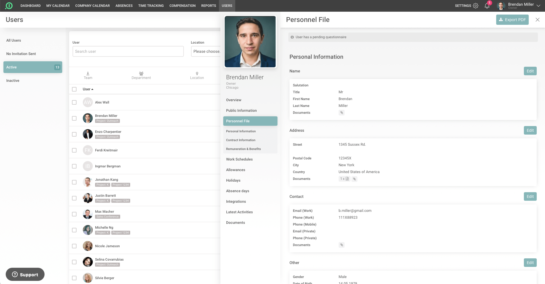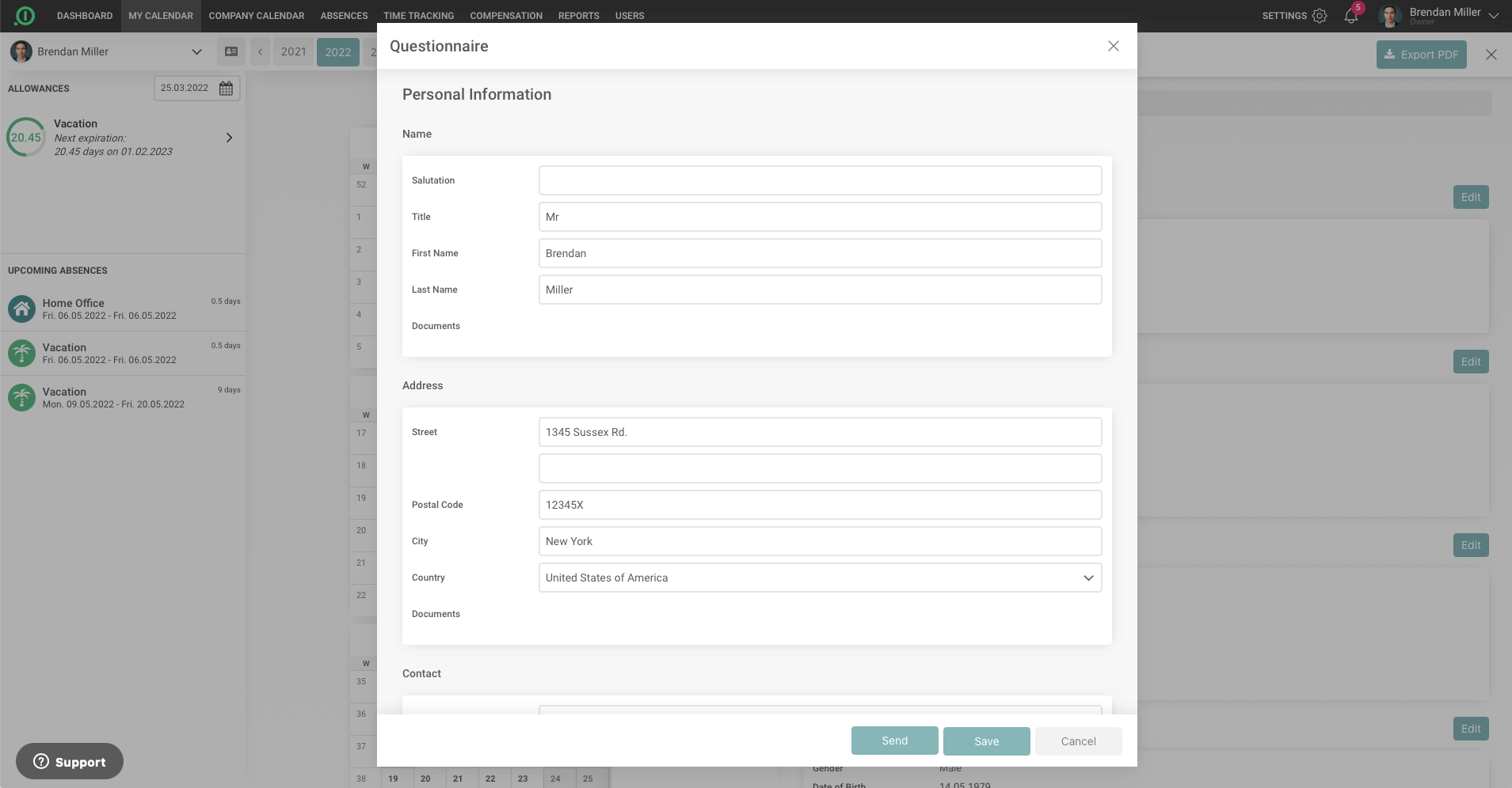With the absence digital personnel file, you manage all important employee data and documents centrally in one software. Via the cloud, you can access your personnel database online from anywhere and from any end device. We rely on the latest encryption technology and maximum security for all sensitive personnel data. As a special additional function, personnel questionnaires can be created digitally, sent and stored directly in the corresponding personnel files.