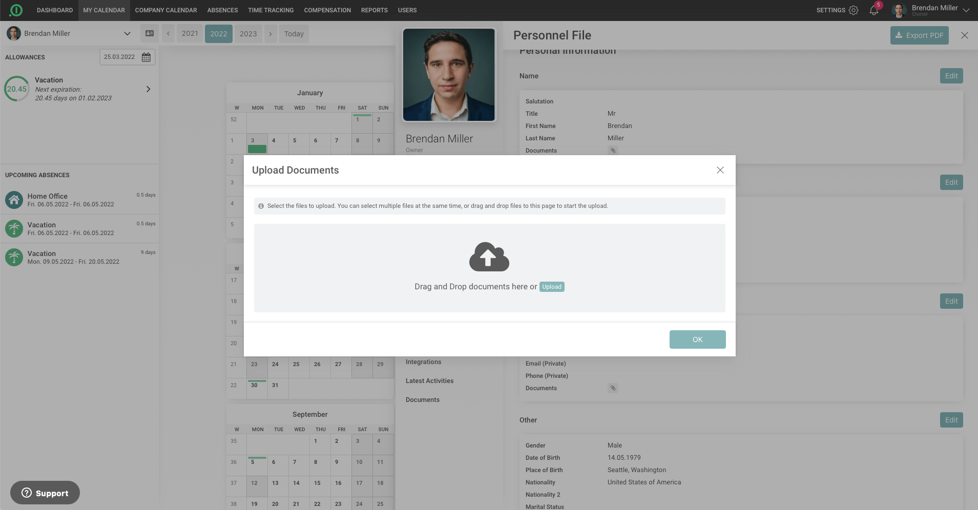 absence focuses above all on simple and intuitive usability. Creating and editing personnel files is self-explanatory and does not require extensive IT knowledge. Files, such as medical certificates, can also be uploaded to the corresponding personnel file simply by dragging and dropping. You can send the personnel questionnaire to the desired person with just one click.